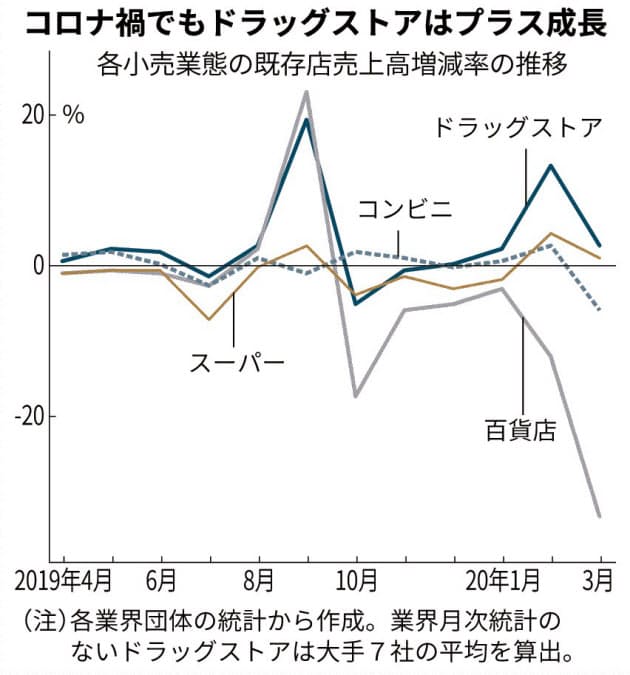 ドラッグストア企業の成長が続いている。2019年度の市場規模は前年度比5.7%増の約7兆7千億円で、調査開始以来、20年連続の成長を達成した。強みは医薬品にとどまらない商材の豊富さだ。新型コロナウイルス禍でマスクなどを求めて来店者が増え、客層も広がった。コンビニエンスストアなどに並ぶ社会インフラとして地位を固めつつある。