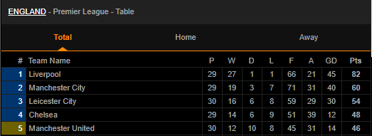 จบเกม วัตฟอร์ด แบ่งแต้มกับ เลสเตอร์ 1-1 ฝั่ง "จิ้งจอกสยาม" มีเพิ่ม 1 คะแนน เตะไปแล้ว 30 นัดมี 54 คะแนน รั้งอันดับ 3 เหมือนเดิม ตามหลัง แมนฯ ซิตี้ อันดับ 2 อยู่ 6 แต้ม แต่แข่งมากกว่า 1 นัด และ เหนือ เชลซี อันดับ 5 อยู่ 6 คะแนน โอกาสไปเล่นฟุตบอลยูฟ่า แชมเปี้ยนส์ ลีก ยังสดใส