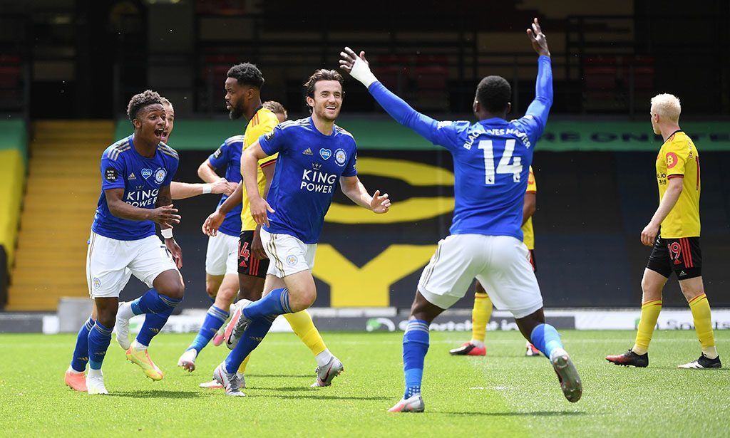 Soccer Football - Premier League - Watford v Leicester City - Vicarage Road, Watford, Britain - June 20, 2020 Leicester City's Ben Chilwell celebrates scoring their first goal with teammates, as play resumes behind closed doors following the outbreak of the coronavirus disease (COVID-19) Andy Rain/Pool via REUTERS EDITORIAL USE ONLY. No use with unauthorized audio, video, data, fixture lists, club/league logos or "live" services. Online in-match use limited to 75 images, no video emulation. No use in betting, games or single club/league/player publications. Please contact your account representative for further details.