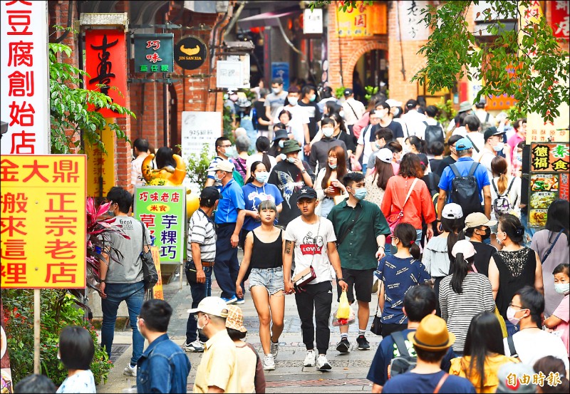 經濟部商業司統計,今年前五月住宿及餐飲業登記家數「逐月增加」,五月甚至比一月多出一千五百多家。商業司表示,業者在疫情期間以休假、暫停營業調整,目前內需已走入振興階段,業者也恢復營業,因此出現家數成長現象。圖為新北深坑老街觀光人潮。(記者方賓照攝)