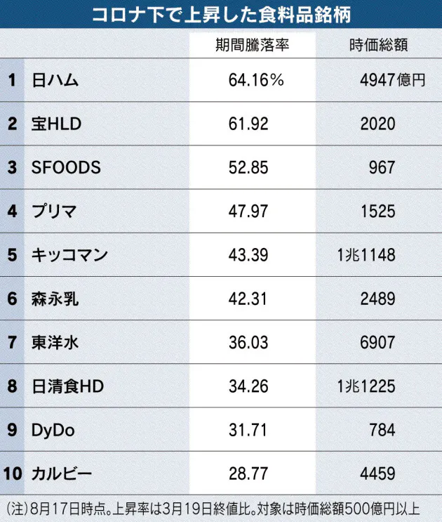 新型コロナウイルスの感染拡大による外出自粛ムードで注目をあびたのが食料品業界だ。家庭向けの一部食料品の需要が拡大している。コロナショック後に上昇した食料品銘柄をランキングにした。対象は時価総額が500億円以上の東証1部上場企業(17日時点)。日経平均株価が底値をつけた3月19日を基準にした。