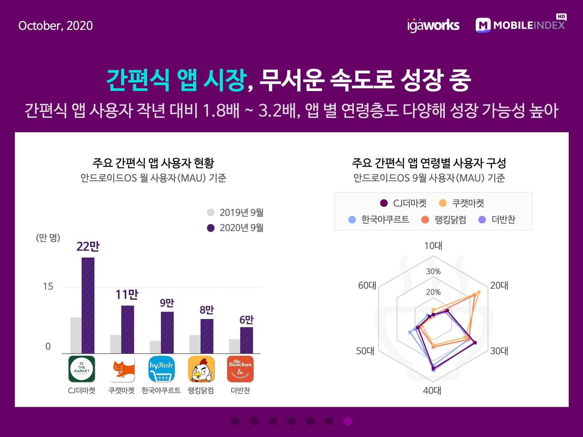 식료품 앱 시장의 성장을 견인한 1등 공신은 ‘신선식품’과 ‘간편식’ 앱이었다. 9월 기준, 신선식품 앱 사용자수는 214만 8,565 명으로 전년 동기 대비 76% 늘었고, 간편식 앱 사용자수는 64만 7,715 명을 기록하며 지난해 보다 120% 급증한 것으로 분석됐다.
