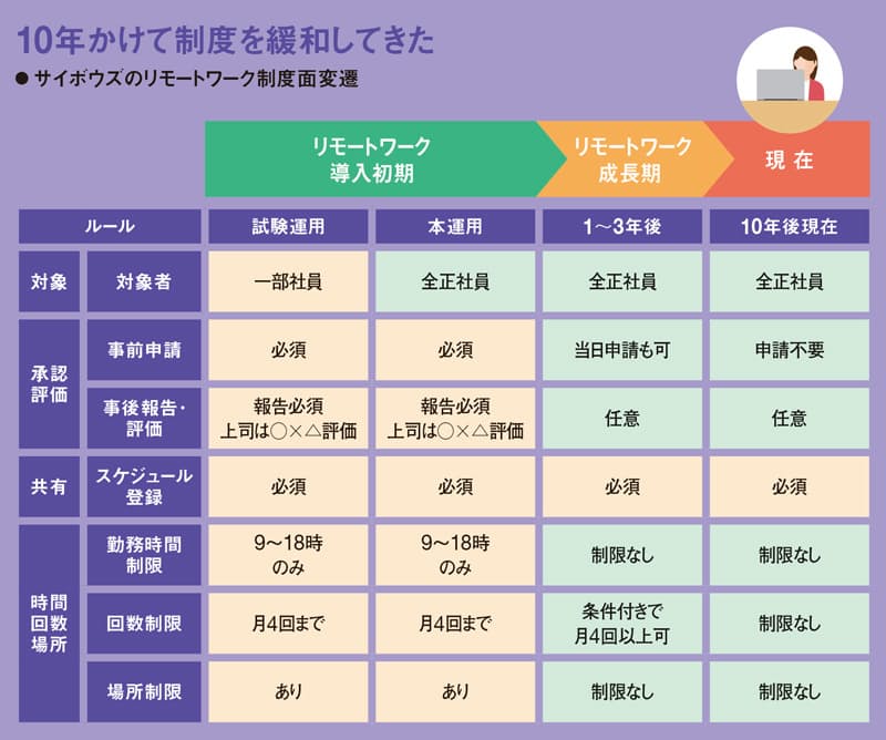 サイボウズがリモートワークを試験的に始めたのは10年8月のこと。サボるやつが出るのではないか。生産性は維持できるのか。不安のあまり、当初はガチガチな管理態勢だった。時間は午前9時から午後6時のみ、回数は月4回まで、場所も申請した通りでないといけないなど制限が多かった。極めつきは終業後の報告で、業務実績に対して上司が「○△×」で評価を付けていた。
